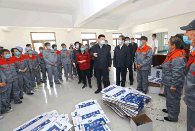 ▲6月8日下午,習(xí)近平在吳忠市紅寺堡區(qū)紅寺堡鎮(zhèn)弘德村扶貧車間,同正在加工制作紙箱的村民交流。