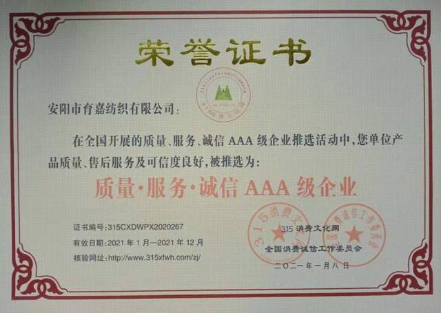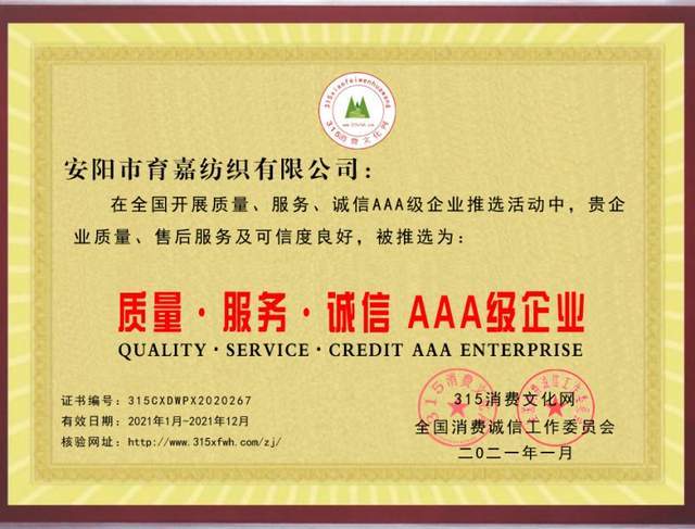 熱烈祝賀安陽(yáng)市育嘉紡織有限公司被推選為“質(zhì)量、服務(wù)、誠(chéng)信AAA級(jí)企業(yè)”