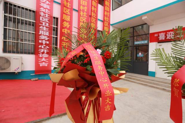 圖為慶賀“田村社區(qū)衛(wèi)生服務(wù)中心”開(kāi)診的條幅和花籃。