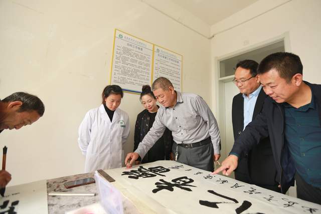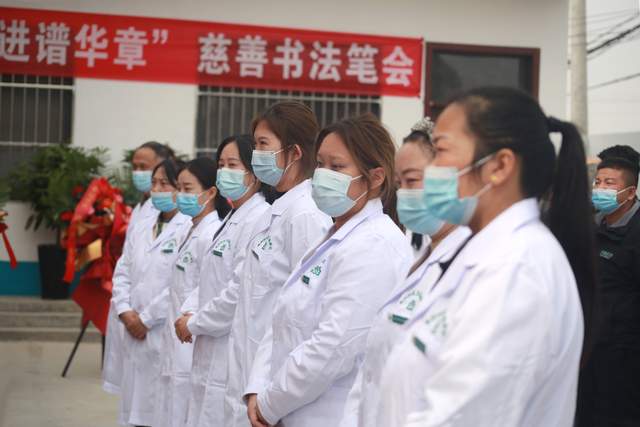 圖為當(dāng)?shù)刂麜?shū)法家為“田村社區(qū)衛(wèi)生服務(wù)中心”開(kāi)診揮毫潑墨,書(shū)寫(xiě)“醫(yī)者仁心”。