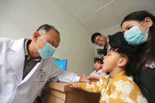 在田村社區(qū)衛(wèi)生服務(wù)中心開(kāi)診當(dāng)天,圖為全科醫(yī)生、黨員楊福慶正在為三歲小朋友張尚軒診斷,觀察其舌苔,望聞問(wèn)切。