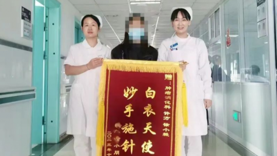 為表達(dá)感激之情,喆喆媽媽特制一面錦旗,和手寫感謝信一并送到殷都區(qū)人民醫(yī)院消化腫瘤科許方護(hù)士和徐小毅護(hù)士手中,“感謝許方護(hù)士和徐小毅護(hù)士的悉心護(hù)理,在一定程度上減輕了孩子的痛苦,也為我們省去了一大筆開銷。我相信在你們美麗的白衣天使護(hù)理下,我的孩子一定會(huì)好起來的,感謝你們!”