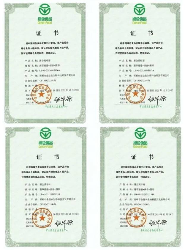 邯鄲市金益農(nóng)生物科技開(kāi)發(fā)有限公司出品的“蒲草婆婆”蒲公英葉茶、蒲公英根茶、蒲公英鮮葉、蒲公英干根、蒲公英干葉等5個(gè)產(chǎn)品,憑借優(yōu)異的品質(zhì),經(jīng)過(guò)層層嚴(yán)格檢測(cè),通過(guò)了中國(guó)綠色食品發(fā)展中心的終審,符合綠色食品A級(jí)標(biāo)準(zhǔn),榮獲國(guó)家農(nóng)業(yè)農(nóng)村部綠色食品認(rèn)證并頒發(fā)綠色食品證書(shū)。