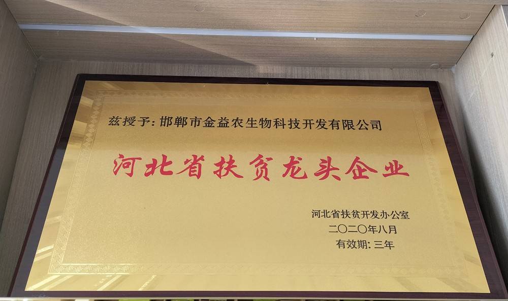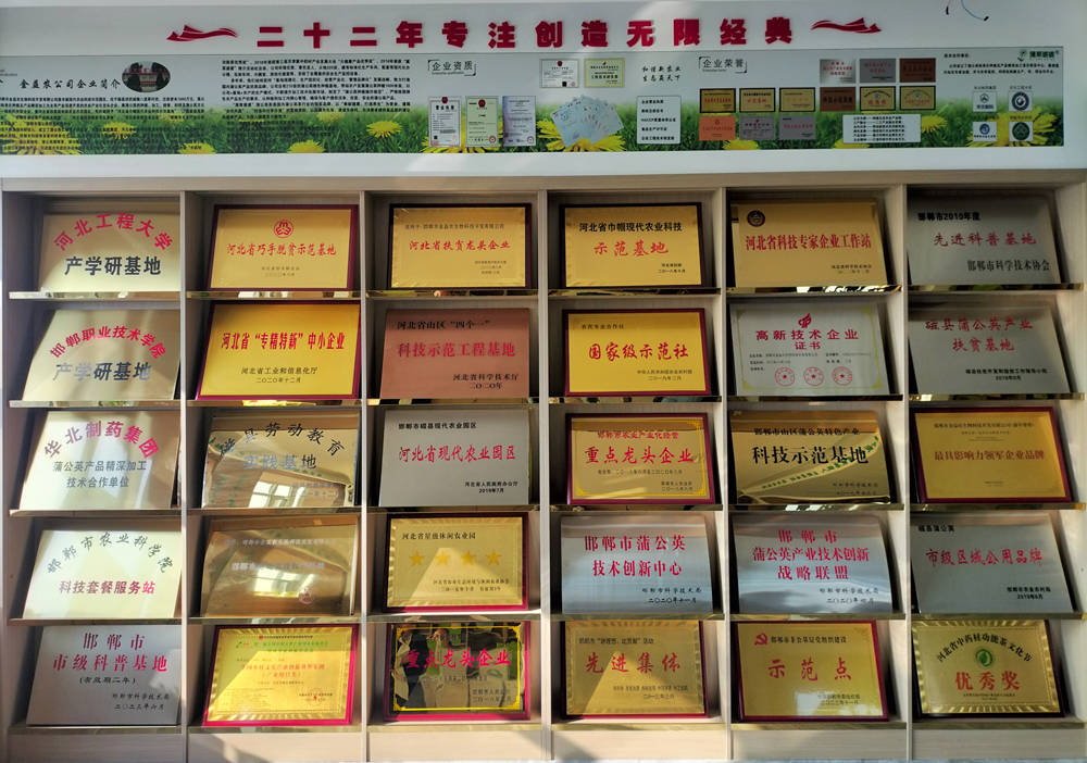 邯鄲金益農(nóng)生物科技開(kāi)發(fā)有限公司先后被授予“國(guó)家級(jí)高新技術(shù)企業(yè)”、“河北省扶貧龍頭企業(yè)”、“河北省科技新型研發(fā)機(jī)構(gòu)”、“河北省四個(gè)一科技示范基地”、“邯鄲市農(nóng)業(yè)產(chǎn)業(yè)化重點(diǎn)龍頭企業(yè)”、“邯鄲市蒲公英產(chǎn)業(yè)技術(shù)創(chuàng)新戰(zhàn)略聯(lián)盟”、“邯鄲市蒲公英技術(shù)創(chuàng)新中心”。