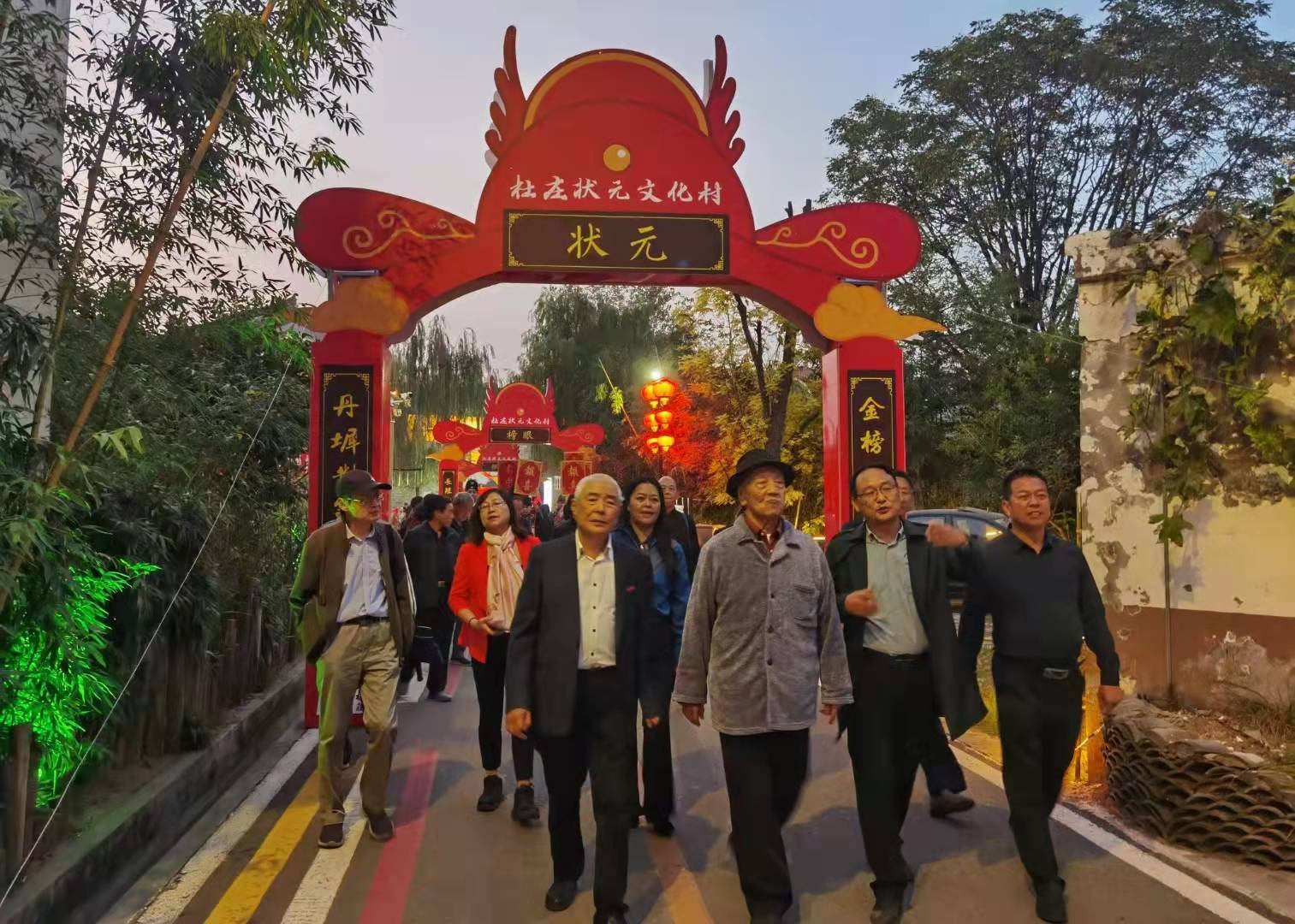 高研作家們集體走進杜莊古鎮(zhèn)狀元文化村采風(fēng),領(lǐng)落和感受淳樸的鄉(xiāng)風(fēng)民俗,那城門樓、耕讀樓、九門長廊、茶戲大院等古建筑,夜幕下彰顯深遠(yuǎn)的文化底蘊。當(dāng)年這村上有八路軍地下交通站,劉少奇、陳毅等曾經(jīng)過地下交通站展轉(zhuǎn)延安去。紅色基因傳承家國情懷。如今以鄉(xiāng)風(fēng)文明之“魂”,引鄉(xiāng)村振興之“路”,打好了綠色食品(果樹、玫瑰、葡萄種植)、鄉(xiāng)村觀光(文物古跡)、田園休閑(亭臺)三張牌。這里白天觀綠化、夜里看亮化、旅游憑文化。從過去的人民公社大食堂遺址吃了晚飯,然后村支書杜春成送大伙乘車返回安陽城區(qū),杜莊留予人們的印記就一個字“美”!