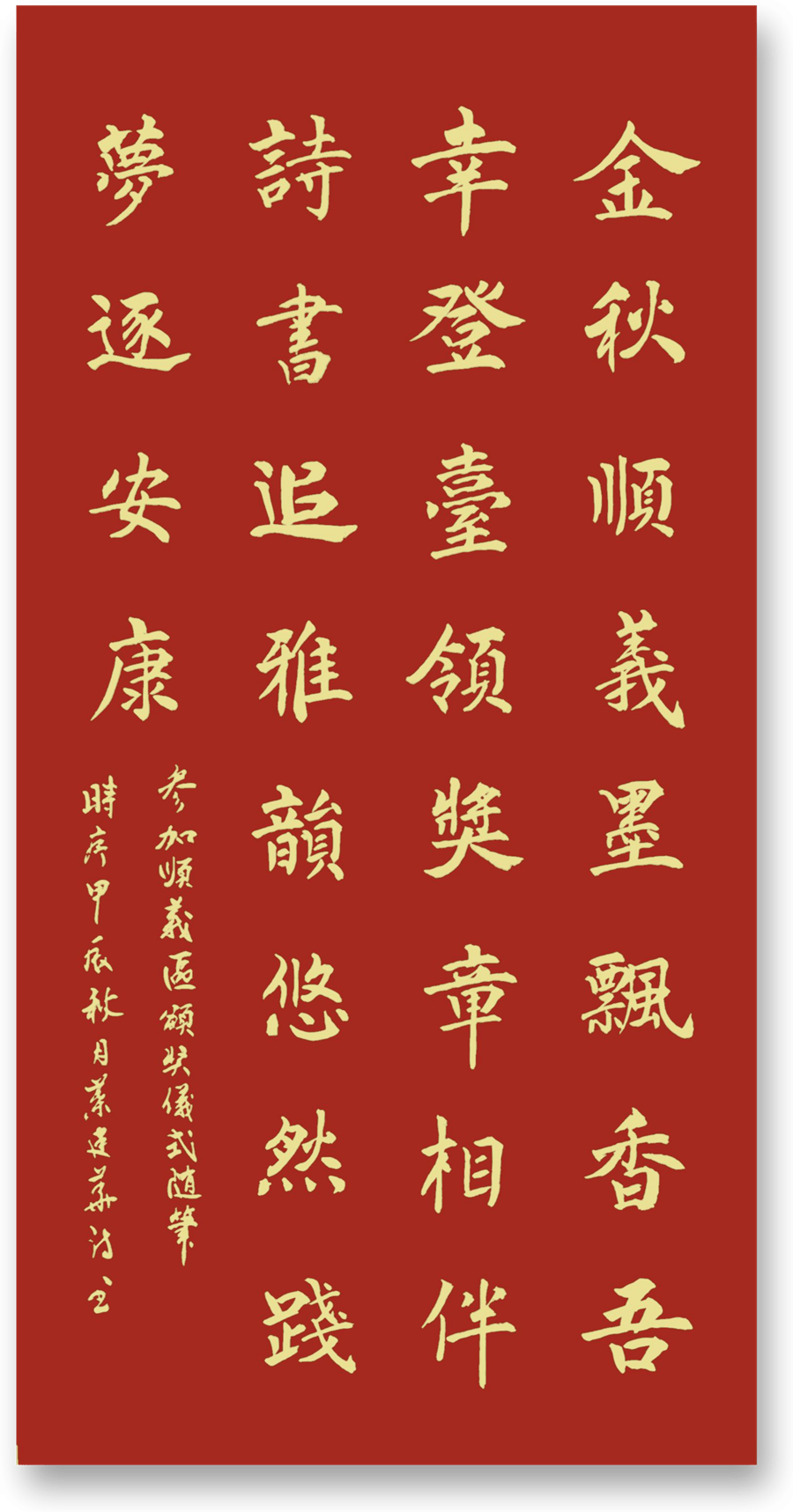 今年是新中國成立75周年喜慶之年,各地各部門都爭相舉辦慶?;顒?。我也應邀參加了好幾個書畫展,其中一個是藍星花園居委會安排的書法作品參加順義區(qū)社會化管理退休人員書畫攝影大賽。我想到今年是龍年,便欣然潑墨揮毫在四尺宣紙上寫了一幅行楷“龍騰”榜書參賽。至于主辦方告訴我要網(wǎng)絡投票,我則告訴他們,此次投稿,重在應邀參與,就不麻煩朋友費時費心為我投票,因此,我連投票的網(wǎng)址也沒有關注。幾天前主辦方告訴我,我的作品獲得了三等獎,并于10月24日下午到順義區(qū)老干部活動中心參加頒獎儀式。