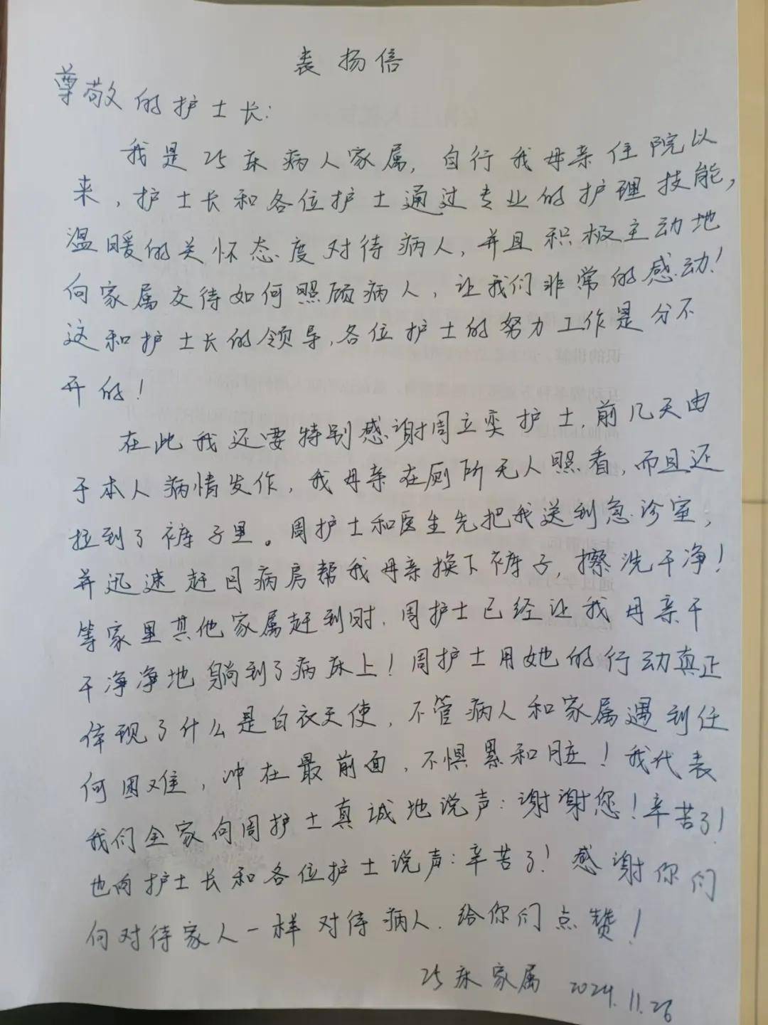 11月26日,殷都區(qū)人民醫(yī)院神經(jīng)外科收到一封表?yè)P(yáng)信, 信中字里行間包含著患者家屬的誠(chéng)摯感激與由衷贊美之情,充分展現(xiàn)了對(duì)殷都區(qū)人民醫(yī)院醫(yī)療服務(wù)的認(rèn)可與信賴(lài)。
