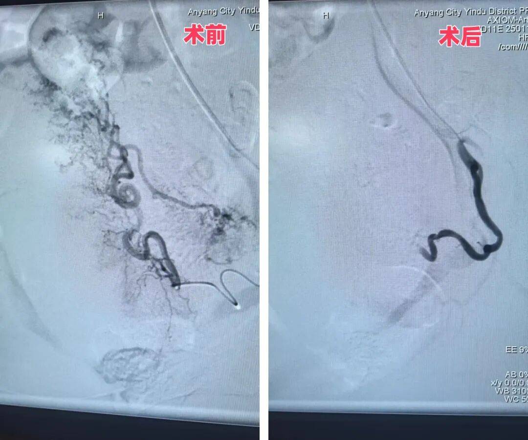 瘢痕妊娠是剖宮產(chǎn)術(shù)后女性再次妊娠的高危并發(fā)癥,極易引發(fā)大出血、子宮破裂等嚴(yán)重后果,屬于臨床兇險的異位妊娠類型。面對這一緊急情況,殷都區(qū)人民醫(yī)院婦產(chǎn)科團(tuán)隊迅速響應(yīng),基于患者病情精準(zhǔn)評估,制定了“先阻斷血供、再行手術(shù)”的診療方案:先行雙側(cè)子宮動脈栓塞術(shù),阻斷瘢痕處血供,為后續(xù)人流手術(shù)搭建安全屏障,從根源上降低大出血風(fēng)險。