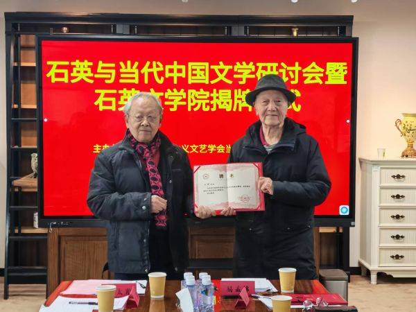 授聘儀式上,李正忠名譽會長和祝東力顧問共同為“石英文學院”揭牌,冷雪松接牌。魯太光會長為顧問李正忠、祝東力、曾凡華、易運和、朱金平頒發(fā)了聘書;李正忠名譽會長為石英名譽院長頒發(fā)了聘書,曾凡華顧問為冷雪松常務(wù)副院長頒發(fā)了聘書,易運和顧問為周強副院長兼秘書長頒發(fā)了聘書,朱金平顧問為王丹副秘書長頒發(fā)了聘書。