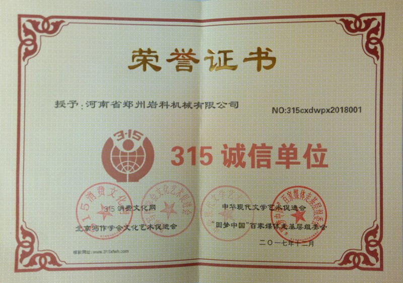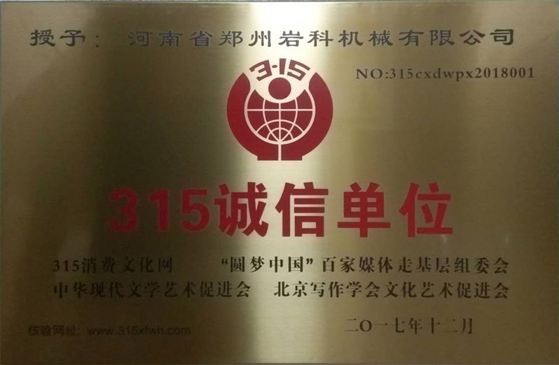 熱烈祝賀鄭州巖科機(jī)械有限公司被推選為“315誠(chéng)信單位”