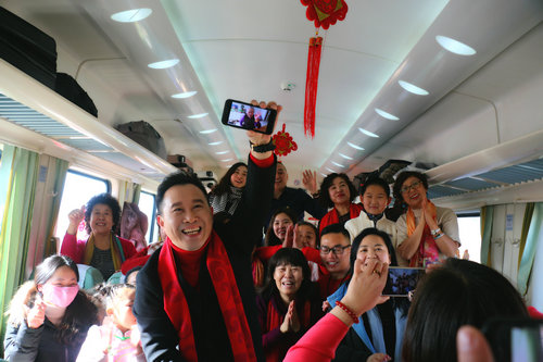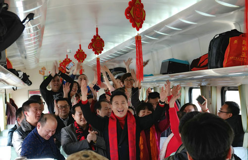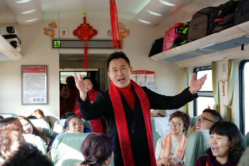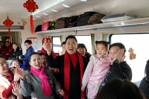 金波“快閃”紅旗列車演唱《喜氣洋洋過大年》