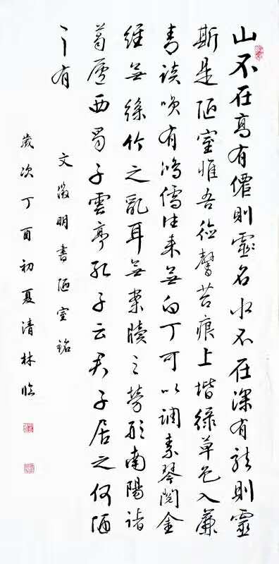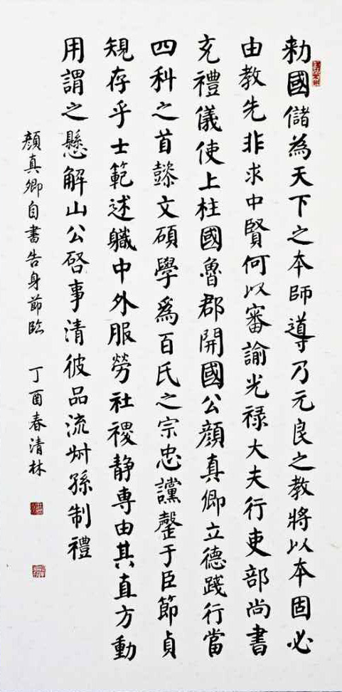 (315消費(fèi)文化網(wǎng) ?書(shū)畫(huà)頻道)田清林? 號(hào)洹南麒麟,1946年出生于河南省安陽(yáng)市,大學(xué)文化?,F(xiàn)為安陽(yáng)市書(shū)法家協(xié)會(huì)會(huì)員,安陽(yáng)市老年書(shū)畫(huà)研究會(huì)會(huì)員。自幼從父練習(xí)顏體楷書(shū),曾臨習(xí)王羲之、顏真卿、趙孟頫、華世奎等書(shū)法賢圣的碑帖。擅長(zhǎng)唐楷顏體書(shū)法。書(shū)法作品多幅在《安陽(yáng)日?qǐng)?bào)》、《老人春秋》、《安陽(yáng)大學(xué)報(bào)》和《安陽(yáng)工學(xué)院報(bào)》上刊登;作品多次入展河南省及安陽(yáng)市書(shū)法家協(xié)會(huì)等組織的書(shū)法作品展或大賽并獲獎(jiǎng);兩幅作品隨安陽(yáng)周易研究會(huì)文化交流團(tuán)在臺(tái)灣展出并被臺(tái)灣周易研究會(huì)收藏。退休前任安陽(yáng)大學(xué)圖書(shū)館館長(zhǎng),兼任大學(xué)書(shū)法課教師。退休后擔(dān)任安陽(yáng)工學(xué)院離退休處書(shū)法班教師。