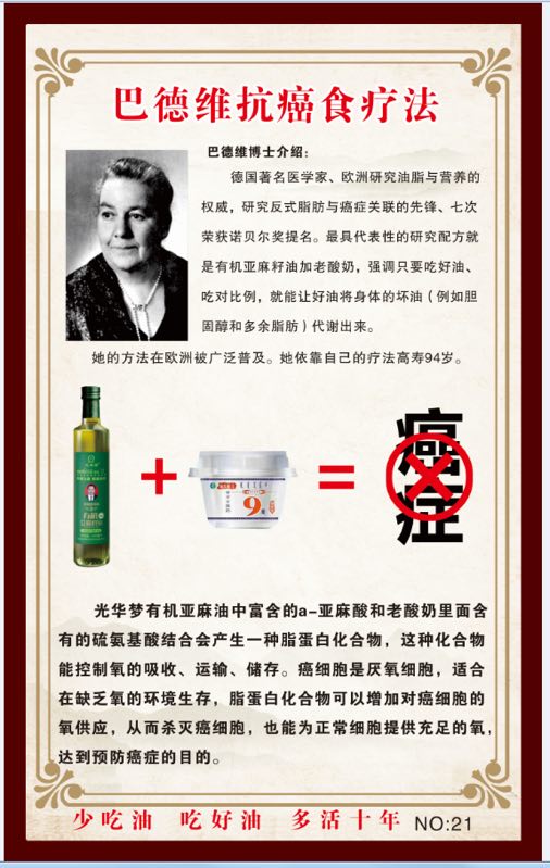??? 其實(shí),巴德維治療癌癥的獨(dú)特配方也不復(fù)雜,如將10到15毫升亞麻酸和自制酸奶或原味酸奶攪拌至水乳交融的狀態(tài)后食用,再讓患者食用后曬太陽一小時(shí),一天兩到三次,兩至三星期后,癌癥癥狀就會(huì)消失或逐漸減弱。