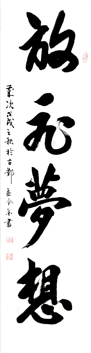 ??? 提起友人書家,孟令金習書的經(jīng)歷我就贊嘆不已,難己于言。約而道之蓋有如下感言:孟令金,男,河南省安陽市人,一九五八年生,現(xiàn)年六十歲。大學文化程度、干部。令金自幼出身于書香門第之家,其父身為教書育才的先生。受父親的影響自幼就酷愛上了習書學法,良好的家庭影響、又俱有了較高的高等文化程度,為其奠定了優(yōu)越的習書條件。令金識力之高、孜孜不倦、勤耕不輟、堅持習書,研習了大量的古今書法理論教材,尤對習書《八法》情有獨衷,多年精研,探索用筆《三原則》即:中鋒、鋪毫、逆入逆收。取法呼上、甘苦親嘗融技法于理論之中深得其功。
